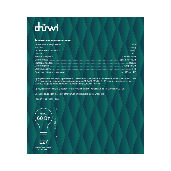 - Максимальная мощность лампы, Вт: 60
